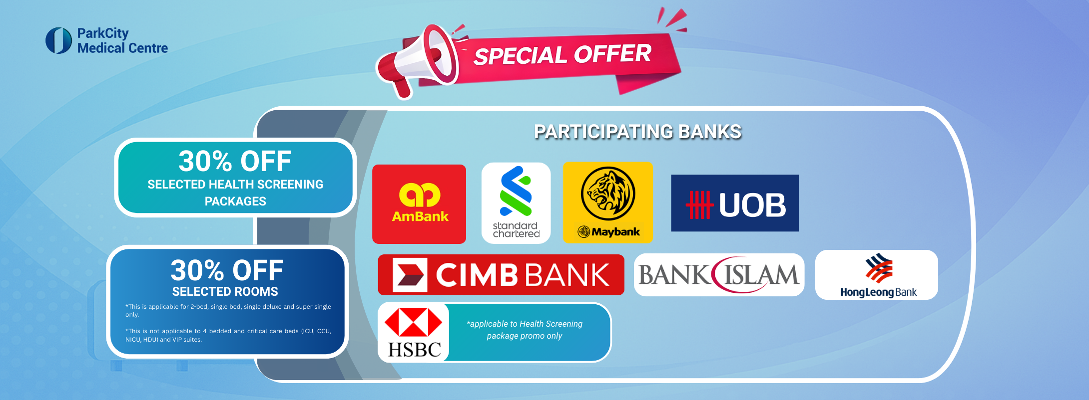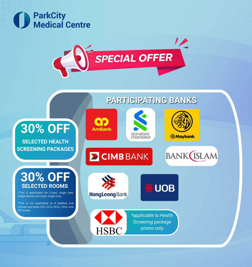 • The participating banks will not be held liable for any mishaps, injuries or accidents that may occur from the medical services offered by PMC. Any query and/or dispute on the medical services must be directed to and resolved directly with PMC.